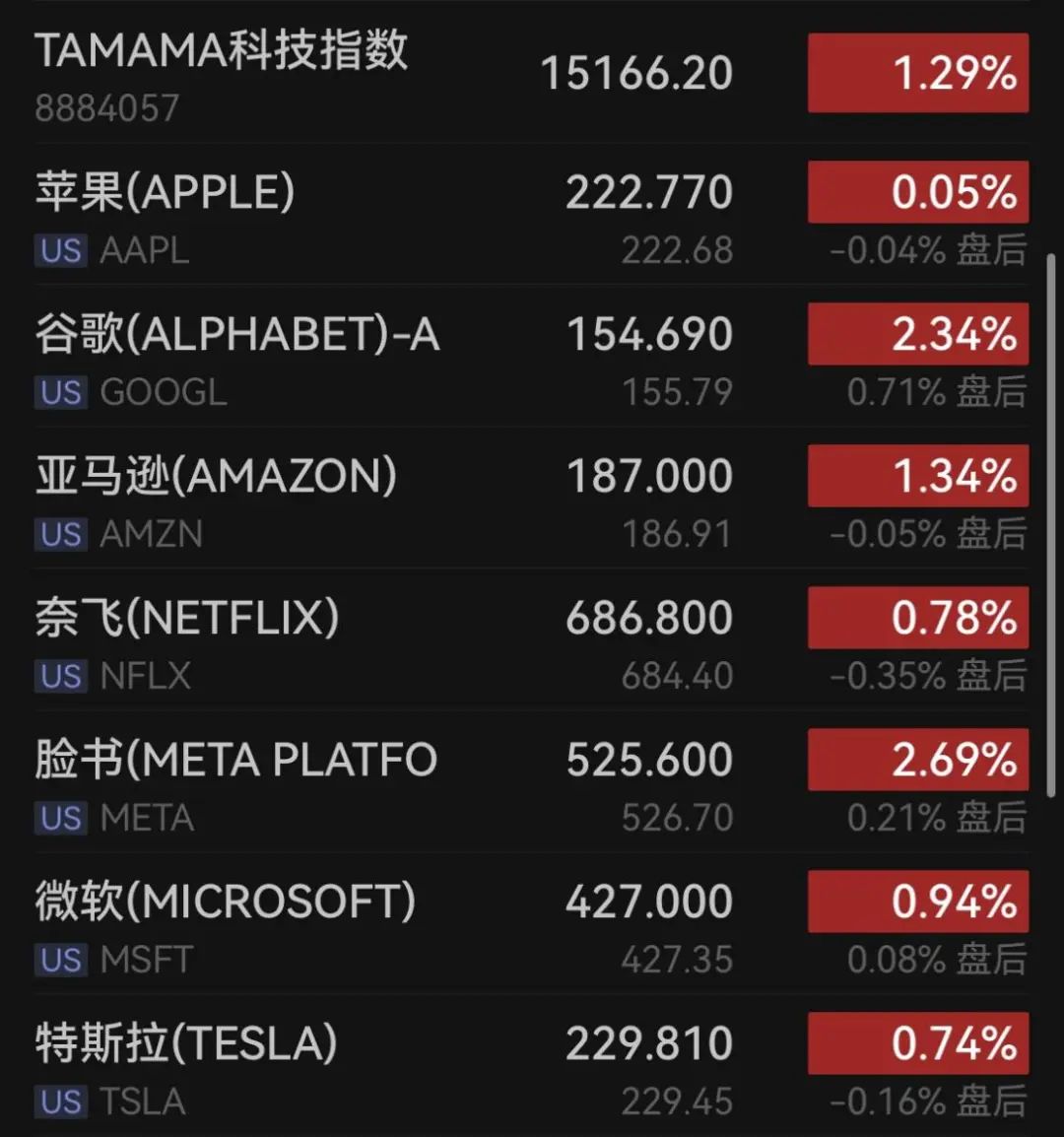 科技股全线走高,苹果涨0.05%,亚马逊涨1.34%,奈飞涨0.78%,谷歌涨2.34%,脸书涨2.69%,微软涨0.94%,特斯拉涨0.74%。