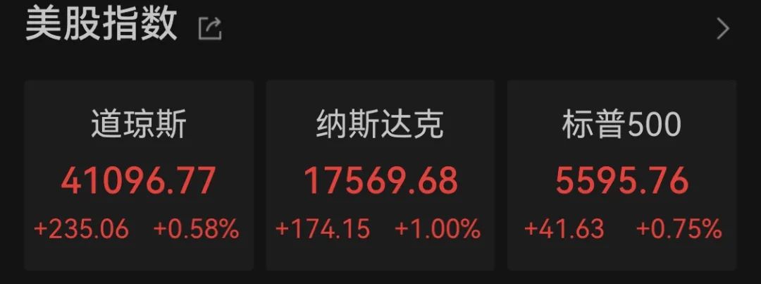 截至收盘,道指涨235.06点,涨幅为0.58%;纳指涨174.15点,涨幅为1.00%;标普500指数涨41.63点,涨幅为0.75%。