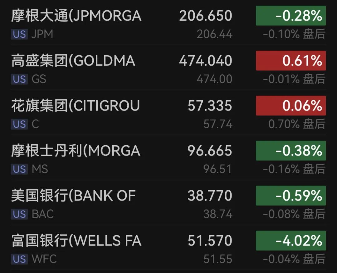 银行股多数下跌,摩根大通跌0.28%,高盛涨0.61%,花旗涨0.06%,摩根士丹利跌0.38%,美国银行跌0.59%,富国银行跌4.02%。