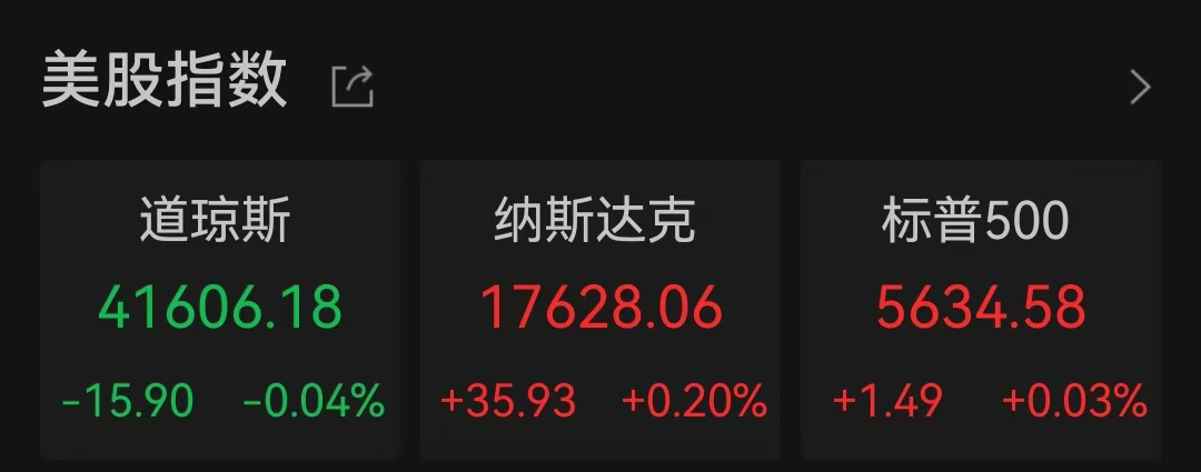 当地时间9月17日,美股三大股指收盘涨跌不一,数据显示,截至收盘,道指跌0.04%报41606.18点,标普500指数涨0.03%报5634.58点,连续第七日上涨,纳指涨0.2%报17628.06点。