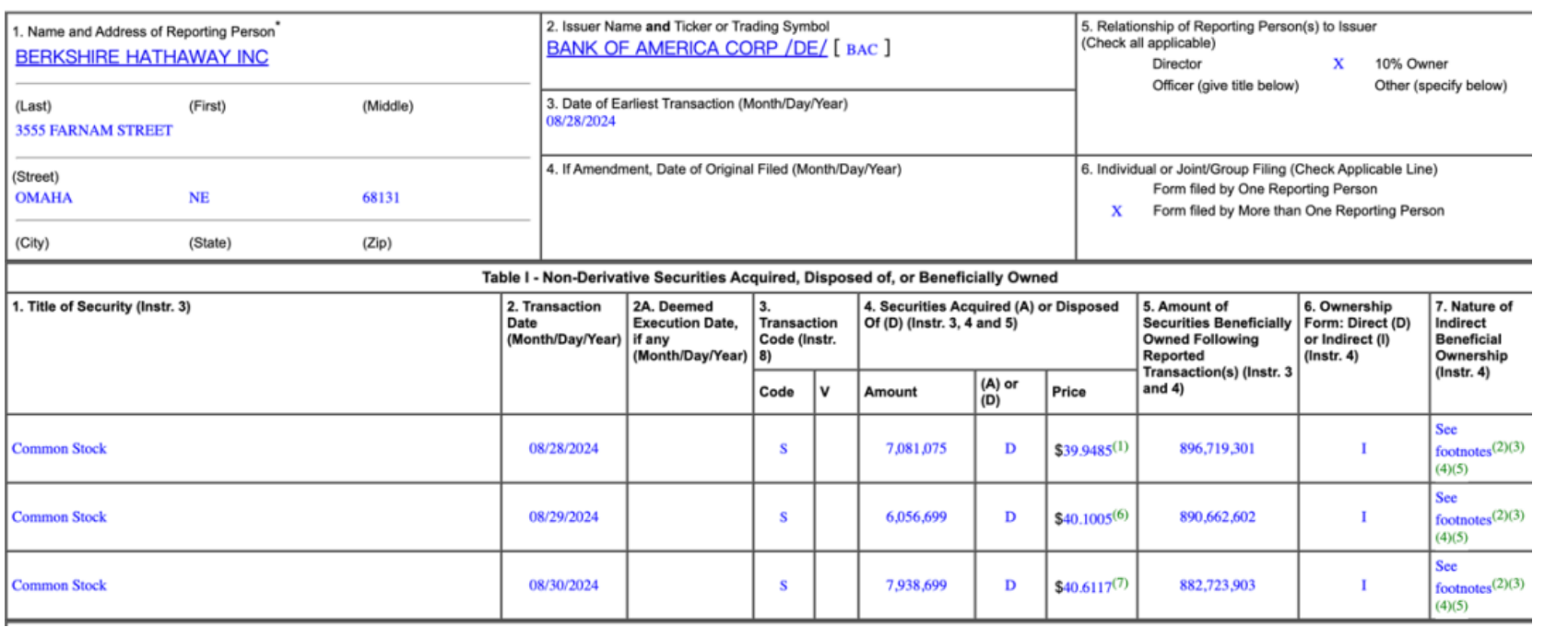伯克希尔哈撒韦减持美国银行股票文件 (图片来源:SEC)