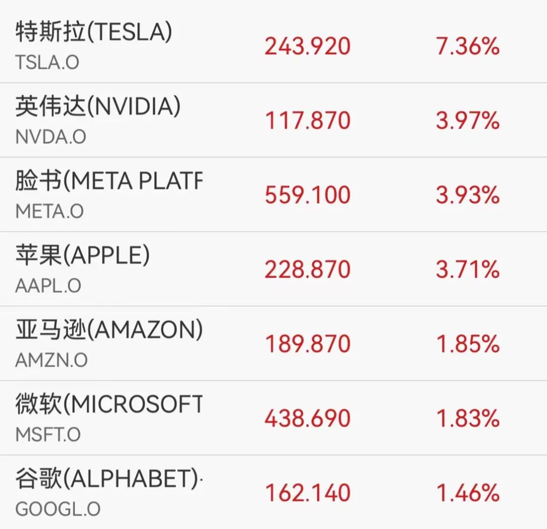 大型科技股齐涨,特斯拉涨超7%,创2个多月以来收盘新高;英伟达涨近4%,苹果涨超3%。