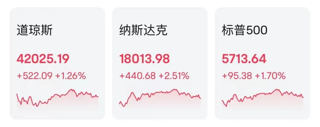 美东时间9月19日,美联储降息50个基点次日,美股三大指数全线上涨。截至收盘,道指大涨522.09点,涨幅为1.26%,报42025.19点,首次收盘站上42000点;纳指涨440.68点,涨幅为2.51%,报18013.98点;标普500指数涨95.38点,涨幅为1.70%,报5713.64点,创收盘新高。