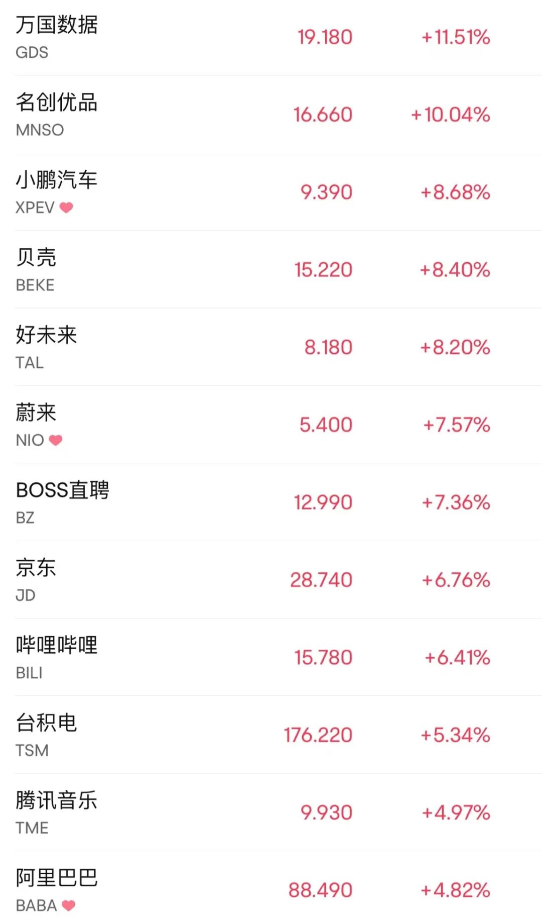 热门股方面,名创优品涨超10%,小鹏汽车涨超8%,蔚来涨超7%,京东、哔哩哔哩涨超6%,腾讯音乐、阿里巴巴、唯品会涨超4%。