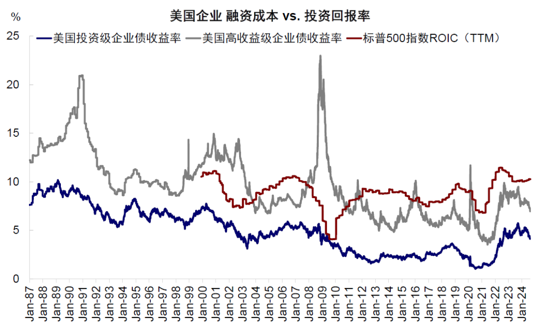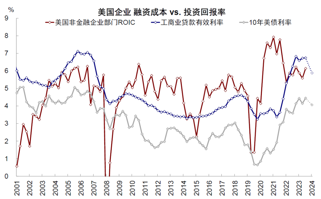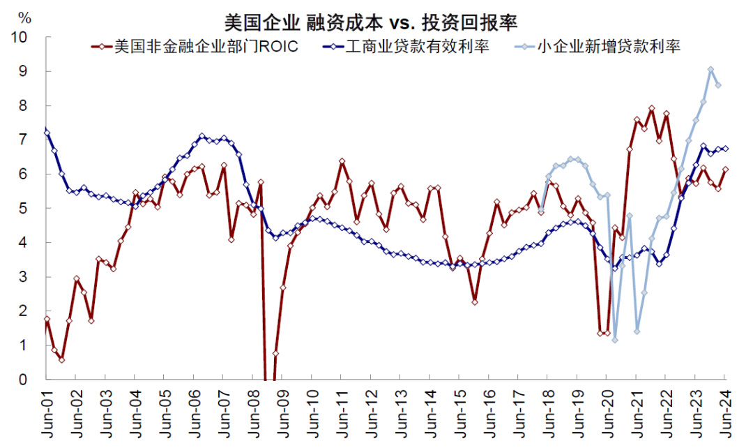 企业部门,融资成本回落且投资回报率回升,大企业已经没有限制性,中小企业限制程度也由330bp收窄至250bp。企业部门的融资渠道兼具间接融资(工商业贷款占比14%)和直接融资(企业债占比40%),大企业更倾向于发债,而小企业更依赖于银行信贷。融资成本方面,高收益级和投资级信用利差自2023年四季度高点分别回落至3.24ppt和1.25ppt,处于30%和15%的历史分位数。再加上基准利率的大幅下行,使得直接融资成本快速回落,高收益级收益率回落260bp(9.6% vs. 7%),投资级债券收益率回落163bp(6.6% vs. 5%)。间接融资的工商业贷款收紧标准也大幅回落,中小企业新增融资成本也从9%回落至8.6%。对比之下,投资回报率却有所上升。标普500指数ROIC自本轮加息以来始终高于信用利差,当前仍温和向上,与信用利差的差值进一步扩大,反映大企业融资并未受到抑制。非金融企业部门ROIC时隔两个季度出现修复,二季度由5.6%回升至6.1%,与中小企业新增融资成本的差值由一季度的330bp缩窄至250bp。