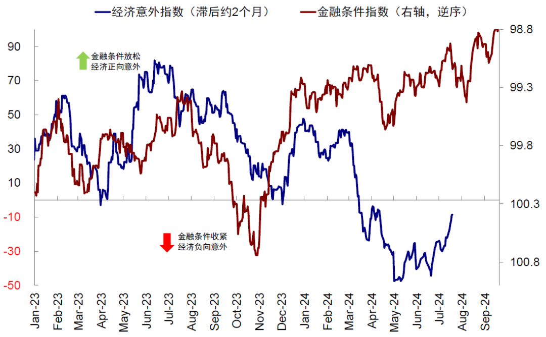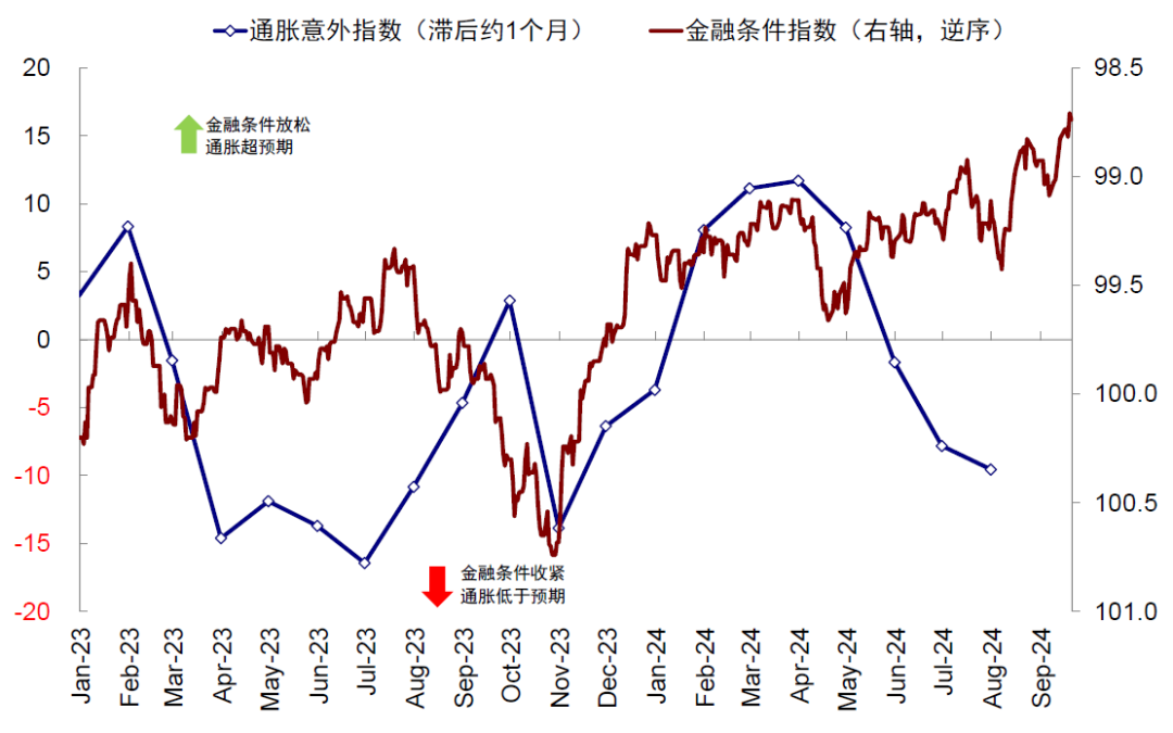 图表7:近期增长意外指数的回升和通胀意外指数的走弱,分别是7月金融条件的放松和8月的收紧的结果