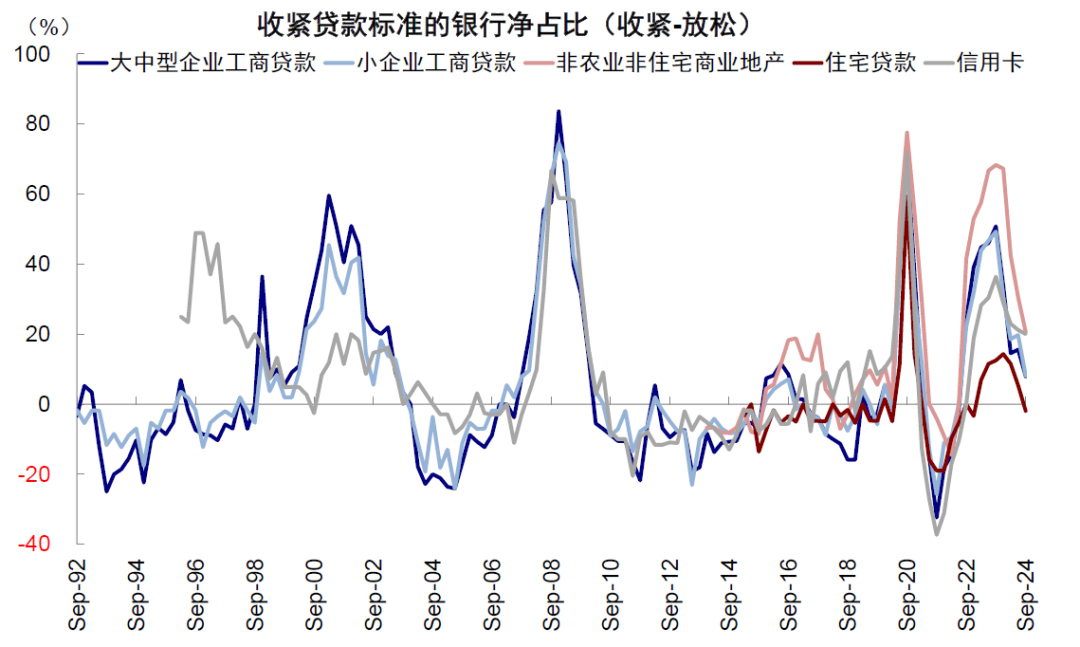 居民部门,降息预期和衰退担忧带动融资成本大幅回落,已经转为宽松。居民信贷结构中,住房抵押贷款占75%,因此我们以房贷抵押贷款利率和租金回报率作为居民部门融资成本和投资回报率的衡量指标。30年期抵押贷款利率与10年美债利率走势基本一致,降息预期升温引导30年期抵押贷款利率迅速回落,目前已经降至6.1%(截止9月19日),大幅低于6.8%左右的租金回报率。同时,三季度银行住宅贷款标准也已经转为放松(收紧-放松的银行占比为-1.9%)。