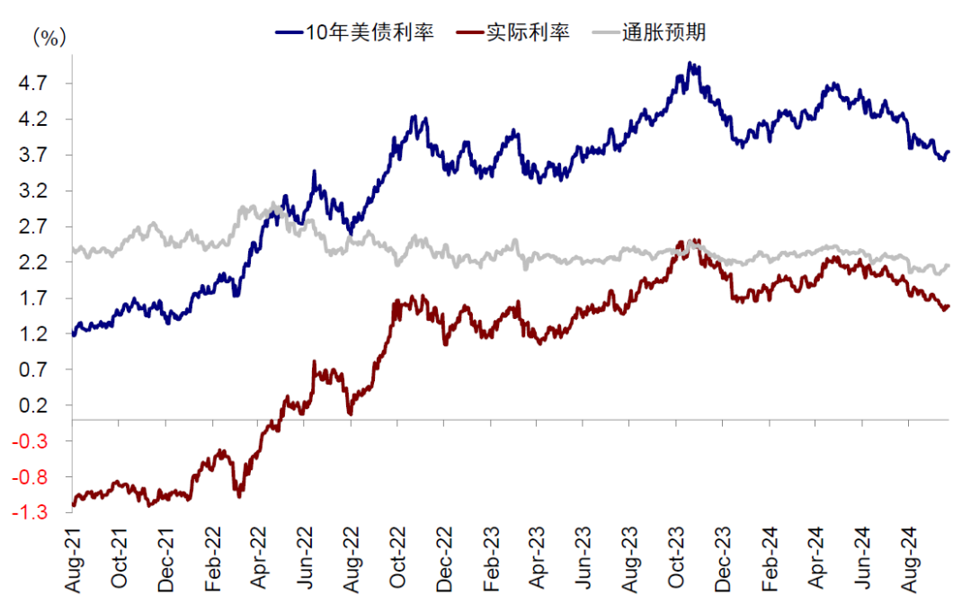 图表11:实际利率回落至1.4%~1.5%,对应10年期美债利率回落到3.5%~3.6%左右
