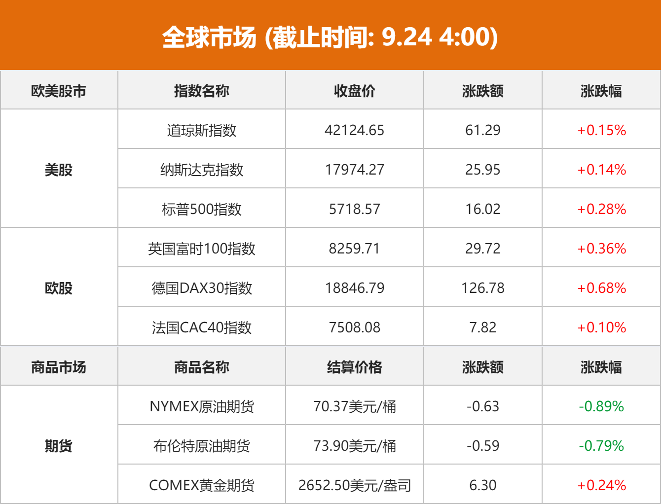 美股市场:美股三大指数小幅收涨,道指、标普创收盘历史新高。截至当天收盘,道琼斯工业平均指数比前一交易日上涨61.29点,收于42124.65点,涨幅为0.15%;标准普尔500种股票指数上涨16.02点,收于5718.57点,涨幅为0.28%;纳斯达克综合指数上涨25.95点,收于17974.27点,涨幅为0.14%。