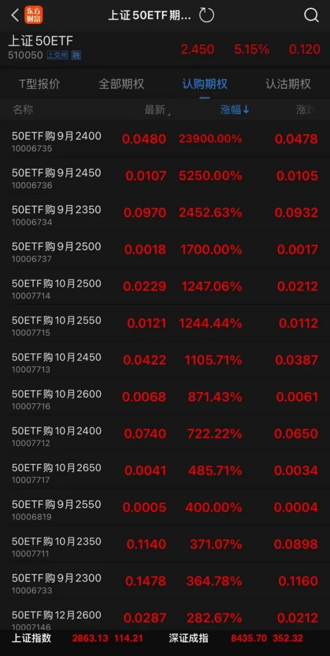 其中,50ETF期权购9月2400合约收盘大涨239倍,上交所沪深300ETF购9月3400合约收盘大涨164倍,深交所沪深300ETF购9月3453A和3500两个合约涨幅超过百倍,分别涨145倍和118倍。