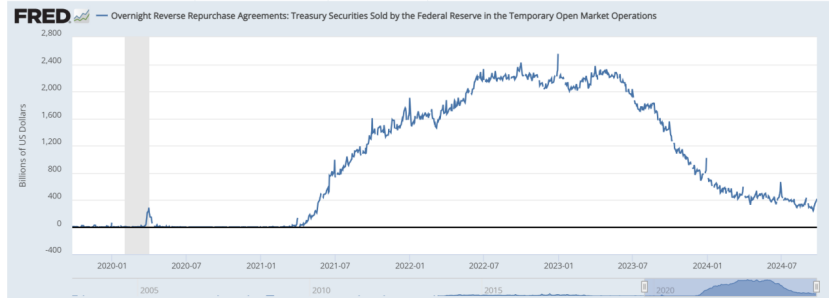 值得注意的是,近期美国市场的流动性可能相当充裕。周三,美联储隔夜逆回购协议(RRP)使用规模为4161.93亿美元。与此同时,有担保隔夜融资利率 (SOFR) 仍维持在相对低位。