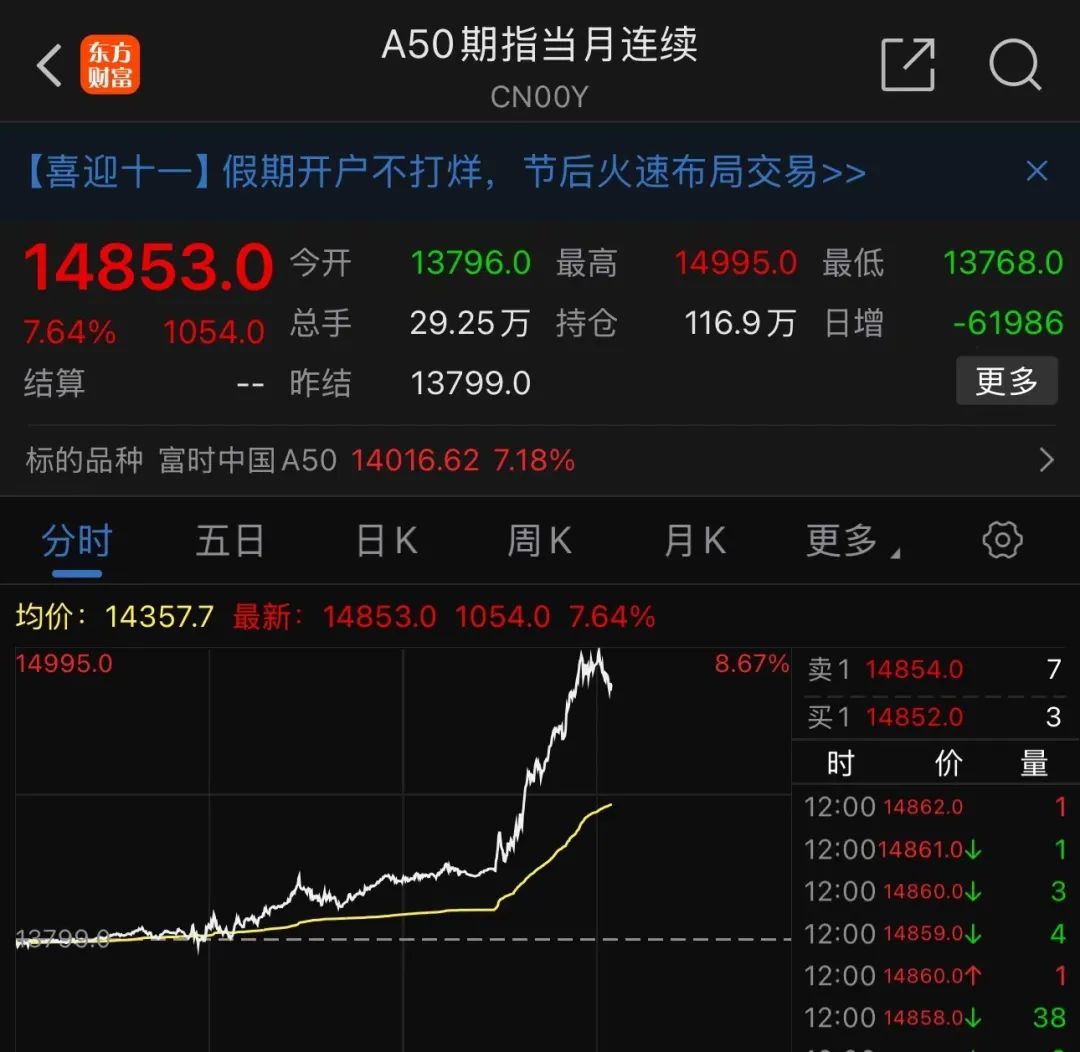 另外,富时中国A50指数期货盘中涨幅扩大至8%,逼近15000点,创2022年7月6日以来新高。
