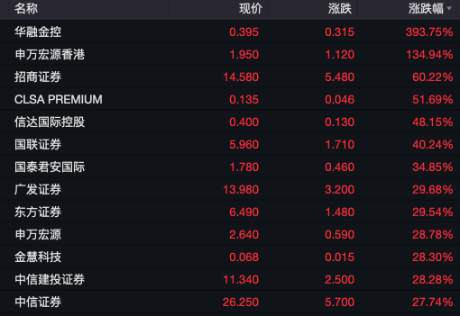 券商股更是持续飙涨。截至午间收盘,申万宏源香港暴涨135%,招商证券大涨超60%。国泰君安国际、国联证券等个股均涨超30%,中信建投证券、中信证券涨超25%。
