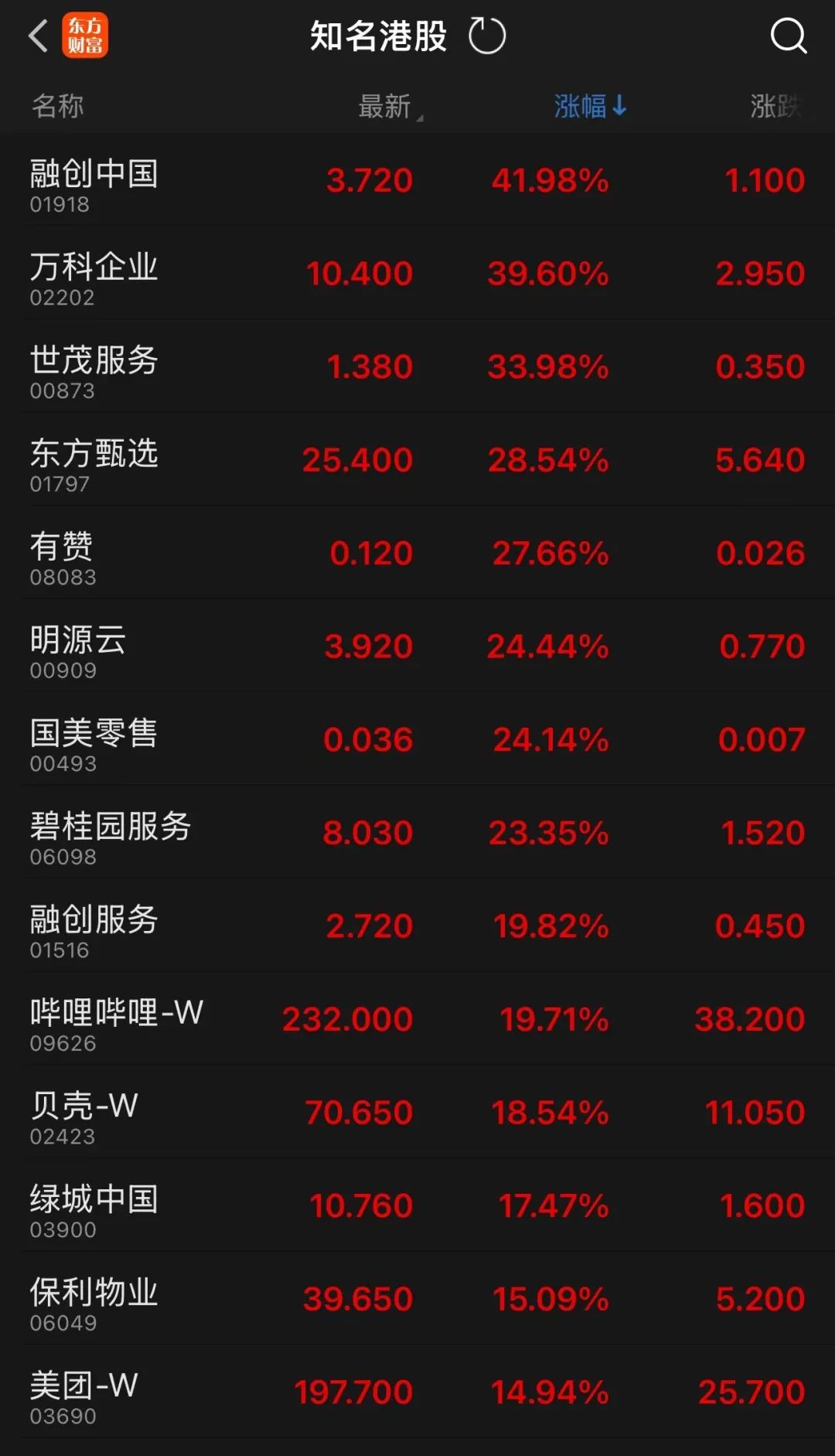 知名港股均暴涨。地产股中,融创中国、万科企业、世茂服务均涨超30%。另外,东方甄选、国美零售、碧桂园服务、哔哩哔哩-W、绿城中国、保利物业等个股均涨超15%。