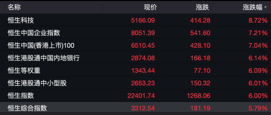 截至午间收盘,港股三大指数放量大涨,恒指上涨6%,刷新2023年1月以来高位;恒生科技指数涨8.72%,创2022年2月以来新高。其中,恒生科技指数盘中涨幅一度扩大至10%。