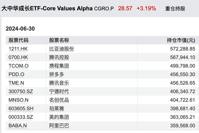 Wind数据显示,截至今年二季度,CVA大中华成长ETF基金(CGRO)主要仓位集中在美股上市的中概股和港股,例如,港股的比亚迪股份、腾讯控股,美股的携程、拼多多、腾讯音乐、名创优品、阿里巴巴;A股持有的则主要是宁德时代、珀莱雅、美的集团。