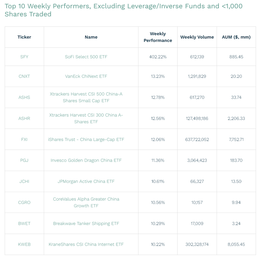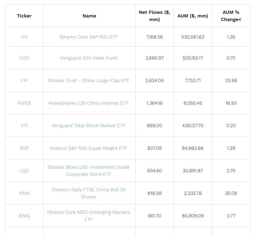 ETF.com网站数据显示,上周资金流入最多的十只ETF中,有三只是中国基金,还有一只是广义新兴市场ETF,其中中国股票权重较大。