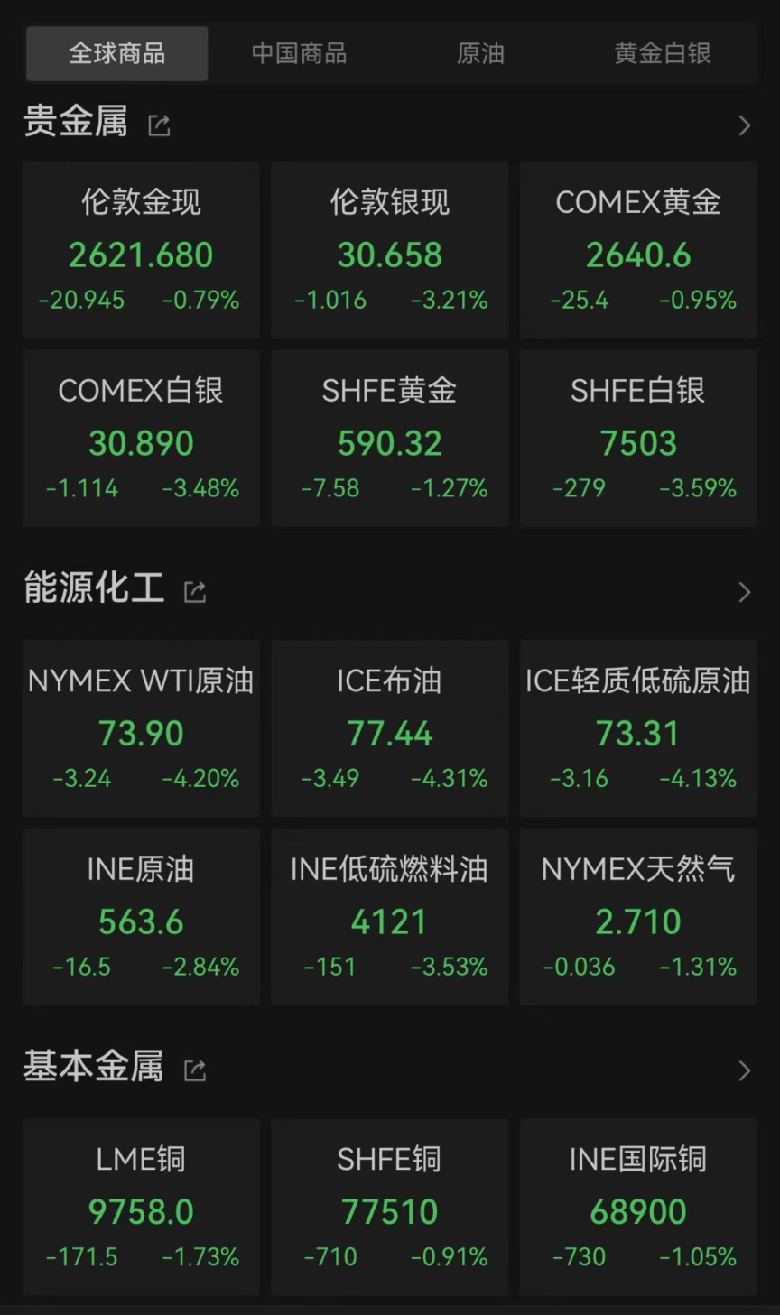 前一日暴涨的油价突然大跌,震动全球金融圈。当日,WTI原油期货结算价跌4.2%,报73.90美元/桶;布伦特原油期货结算价跌4.31%,报77.44美元/桶。全球大宗商品市场全线下跌,黄金下跌近1%,现货白银跌逾3%,基本金属均下跌。