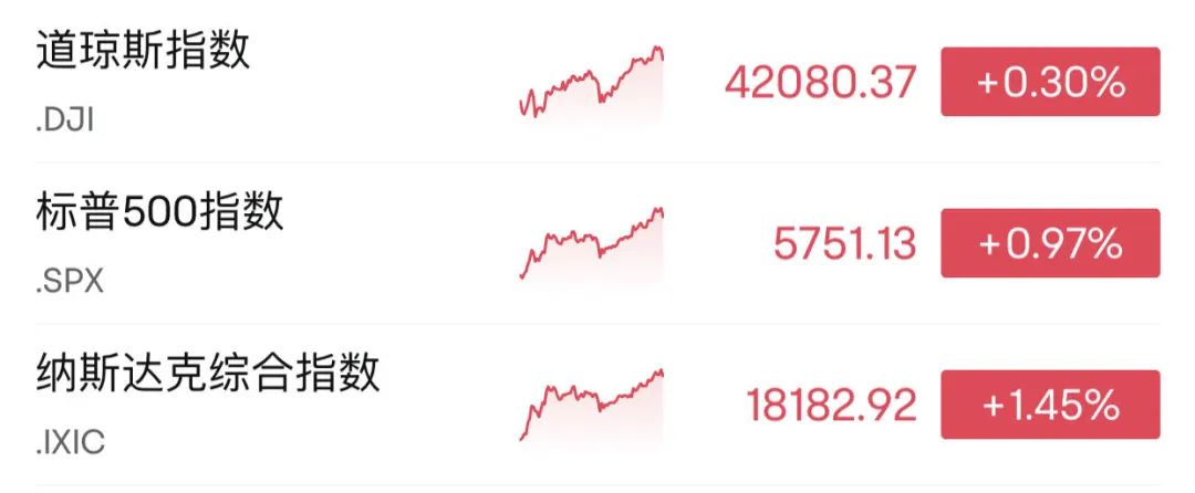 当地时间10月8日,美股三大指数盘中窄幅震荡,尾盘集体拉升。截至收盘,道指涨126.13点,涨幅为0.30%,报42080.37点;纳指涨259.01点,涨幅为1.45%,报18182.92点;标普500指数涨55.19点,涨幅为0.97%,报5751.13点。