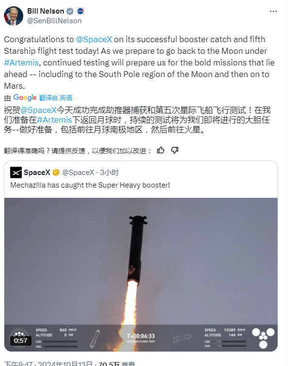 美国航空航天局(NASA)局长比尔·尼尔森在社交媒体上祝贺SpaceX:“随着我们为阿尔忒弥斯计划下重返月球做准备,持续的测试将为即将到来的大胆任务做好准备——包括前往月球南极地区,然后前往火星。”