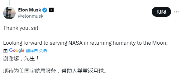 马斯克回复称:“谢谢您,先生!期待为NASA服务,将人类重新带回月球。”