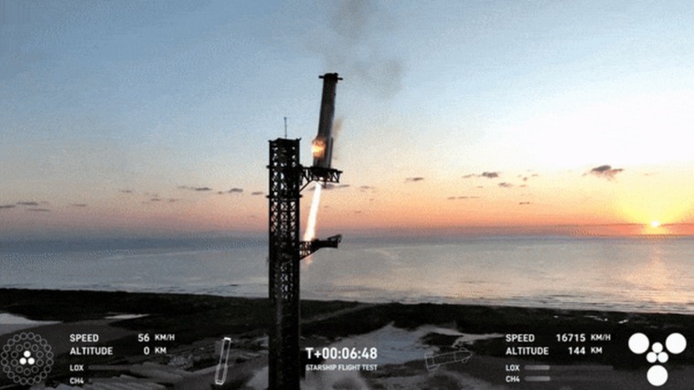 这枚有史以来最大的、性能最强的火箭于纽约时间上午8:25发射升空。在将星舰送入太空后,超级重型助推器返回地球的发射地点,并在着陆时减速。发射塔上的两只机械臂伸出并“抓住”了降落的助推器,当时任务控制中心爆发出欢呼声和掌声。