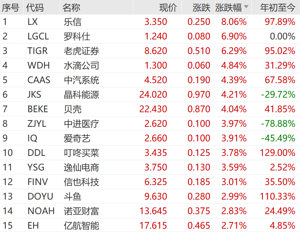 乐信涨8.06%,罗科仕涨6.90%,老虎证券涨6.29%,领涨纳斯达克中国金龙指数成份股。