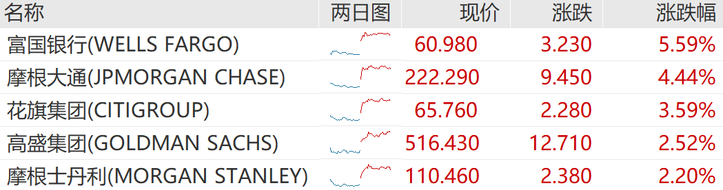 银行股集体大涨,摩根大通涨4.44%,高盛涨2.52%,花旗涨3.59%,摩根士丹利涨2.2%,美国银行涨4.95%,富国银行涨5.59%。