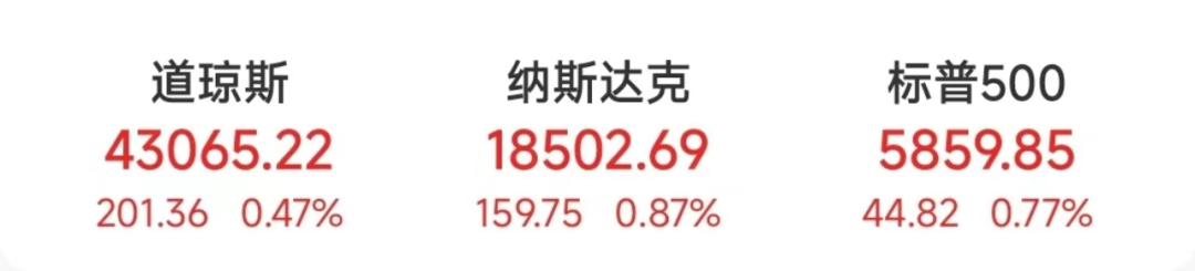 当地时间10月14日,美股三大指数收高。道指涨201.36点,涨幅为0.47%,报43065.22点;纳指涨159.75点,涨幅为0.87%,报18502.69点;标普500指数涨44.82点,涨幅为0.77%,报5859.85点。