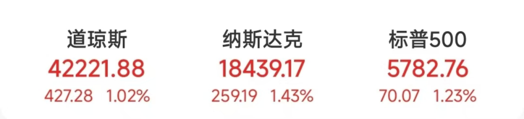 当地时间11月5日,美股三大指数集体收高。道指涨427.28点,涨幅为1.02%,报42221.88点;纳指涨259.19点,涨幅为1.43%,报18439.17点;标普500指数涨70.07点,涨幅为1.23%,报5782.76点。