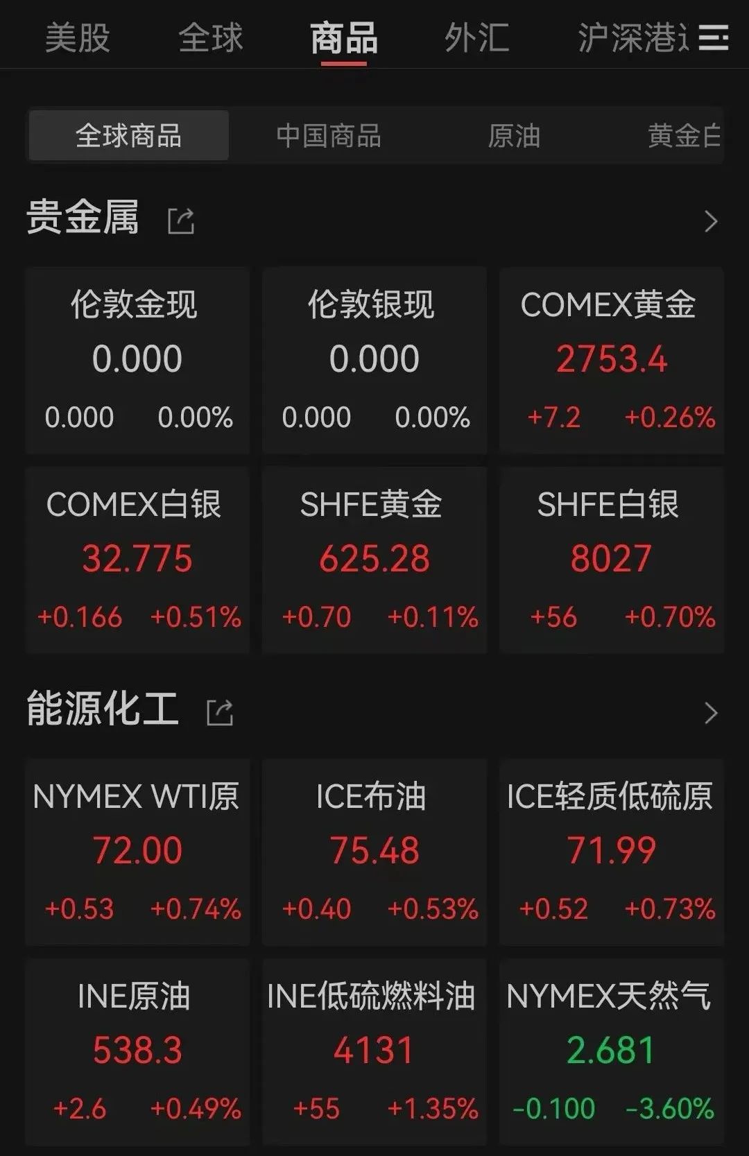 国际贵金属期货普遍收涨,COMEX黄金期货涨0.26%报2753.4美元/盎司,COMEX白银期货涨0.51%报32.775美元/盎司。