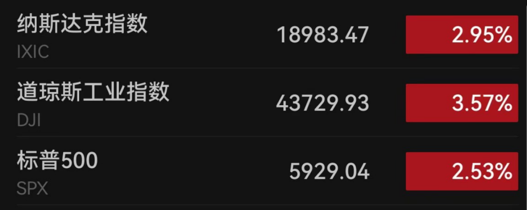 当地时间11月6日周三,美股三大股指集体大涨。截至收盘,道指涨1508.05点,涨幅为3.57%,报43729.93点;纳指涨544.30点,涨幅为2.95%,报18983.47点;标普500指数涨146.28点,涨幅为2.53%,报5929.04点。