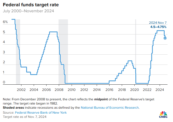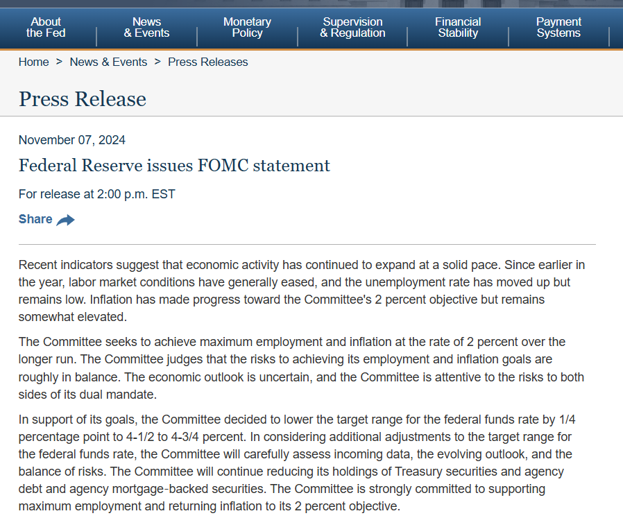 11月8日凌晨,美联储将基准利率下调25个基点至4.50%~4.75%,为连续第二次降息,符合市场预期。上一次是9月份降息50个基点。