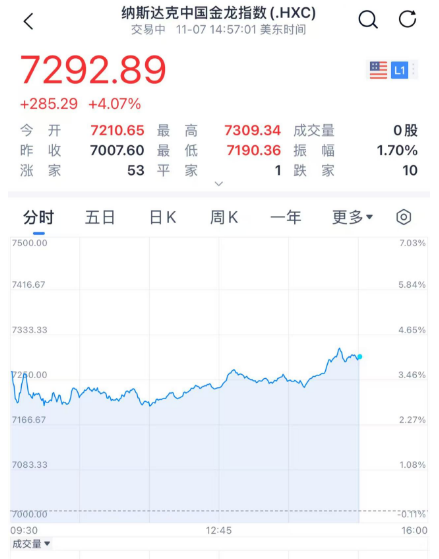 美联储主席鲍威尔发言期间,市场反应不算激烈,美股维持涨势,中概股指数涨幅扩大至4%。