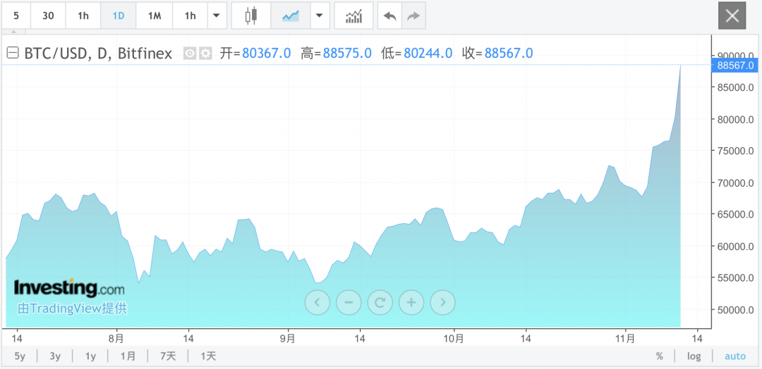 北京时间11月11日晚间,比特币价格突然大幅飙涨,日内大涨近15%,一度突破8.8万美元/枚,截至12日07:00,报88567美元/枚,再度创出历史新高。