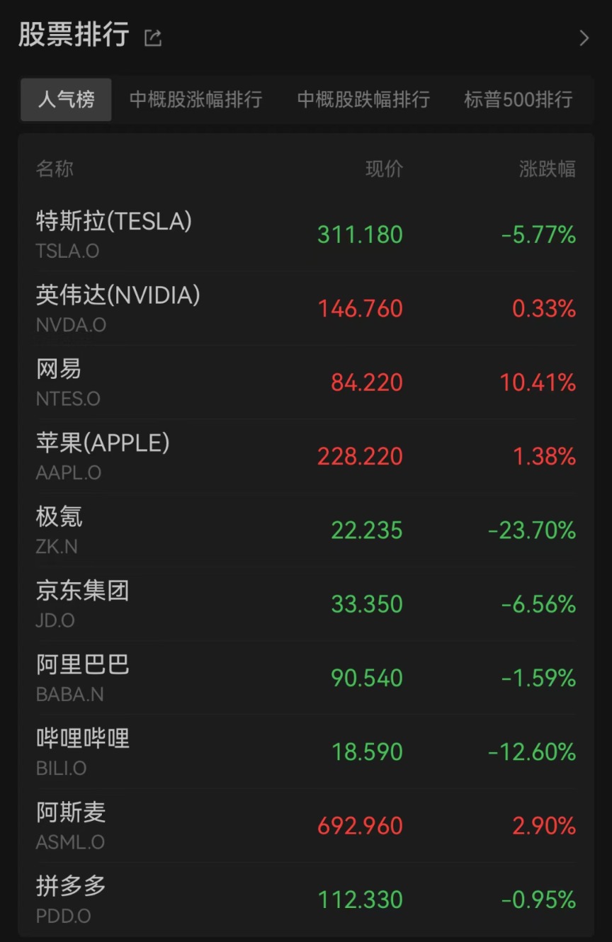 热门中概股多数下跌。纳斯达克中国金龙指数下跌1.81%,极氪跌逾23%,文远知行跌逾17%,哔哩哔哩跌逾12%,京东集团跌逾6%,小鹏汽车跌逾5%,蔚来、贝壳等跌逾3%,阿里巴巴、晶科能源等跌逾1%。涨幅方面,网易涨逾10%,金山云涨逾4%,雾芯科技涨逾2%,爱奇艺涨逾2%。