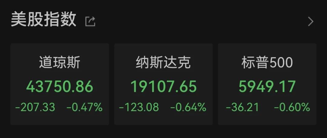 道指跌207.33点,跌幅为0.47%,报43750.86点;纳指跌123.07点,跌幅为0.64%,报19107.65点;标普500指数跌36.21点,跌幅为0.60%,报5949.17点。