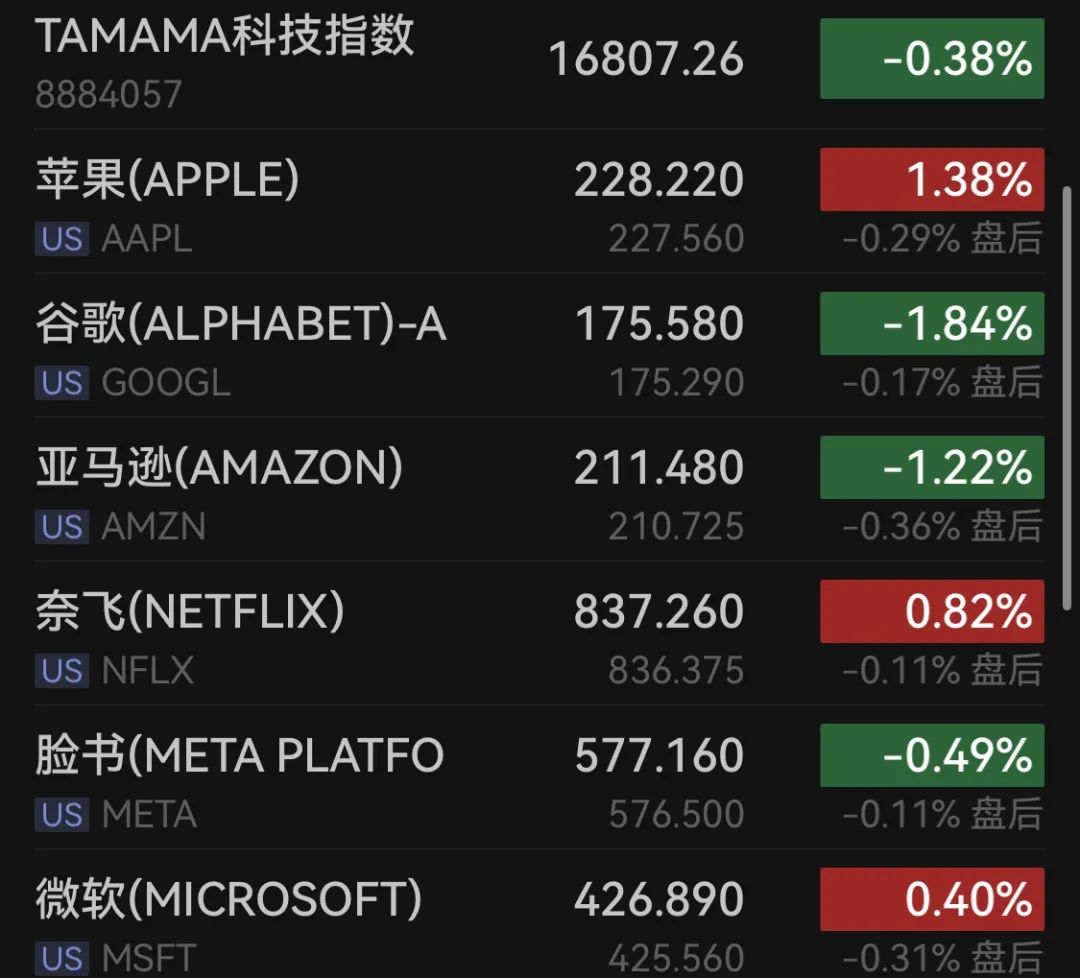 美股大型科技股收盘涨跌不一,TAMAMA科技指数跌0.38%。个股方面,苹果涨逾1%,阿斯麦涨近3%,台积电涨1%,英伟达、微软小幅走高,亚马逊、谷歌、博通跌逾1%。