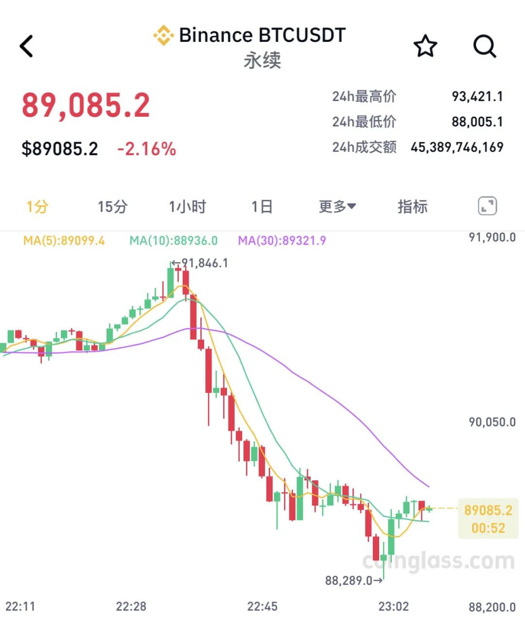 比特币短线急跌。