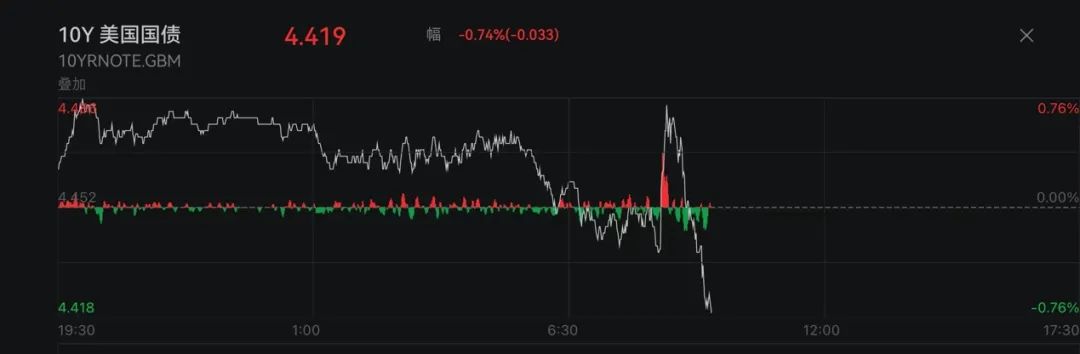 数据公布后,美元短线小幅拉升后震荡下行。美国国债短线拉升后再度下跌,10年期美国国债收益率一度上升至4.478%的历史高位附近,随后快速下探并由涨转跌。
