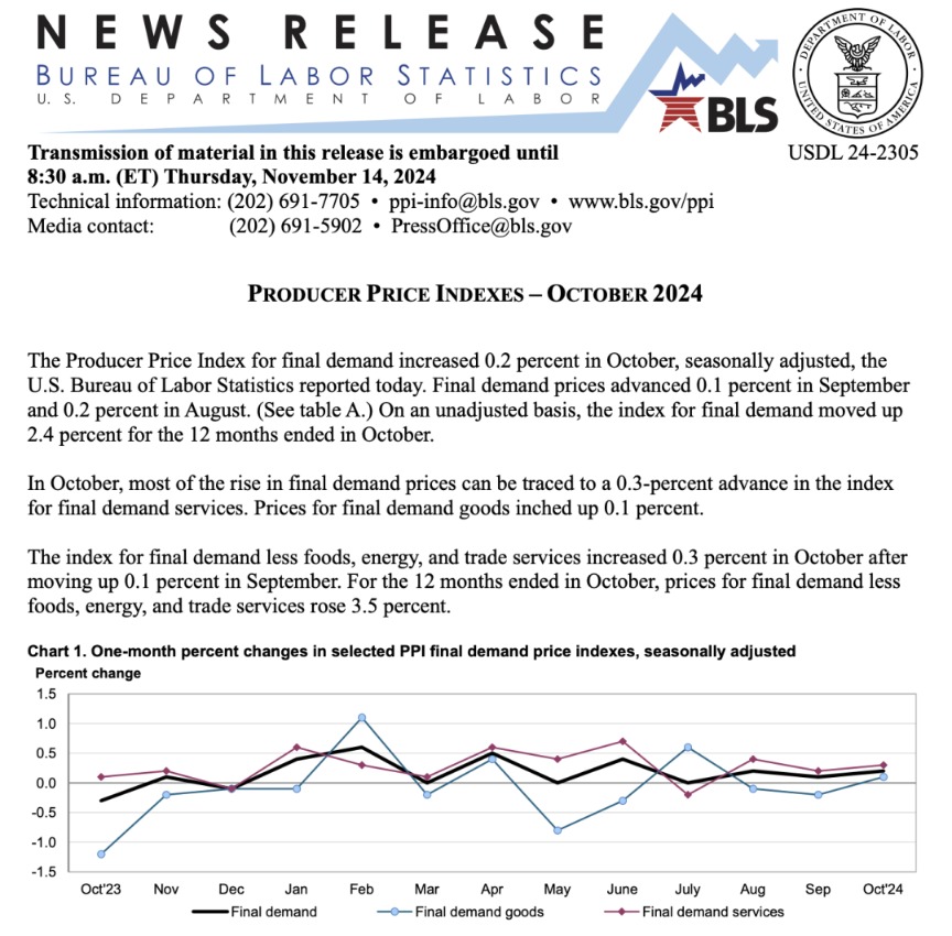 经济数据方面,美国10月PPI同比上升2.4%,预估为2.3%,前值为1.8%;美国10月PPI环比上升0.2%,预估为0.2%,前值为0%。
