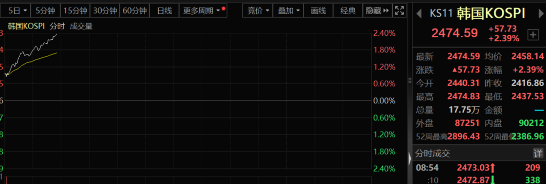 周一早盘,韩国股市大爆发。韩国KOSPI指数大涨近2.4%。