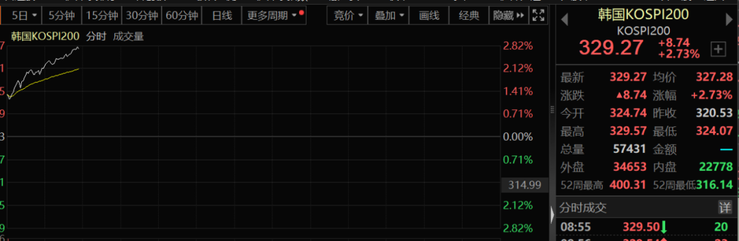 韩国KOSPI200指数大涨超2.7%。三星系大涨,三星电子涨超6%,三星生命涨超10%,三星物产、三星SDI涨超4%;此外,现代汽车、起亚汽车涨超3%。