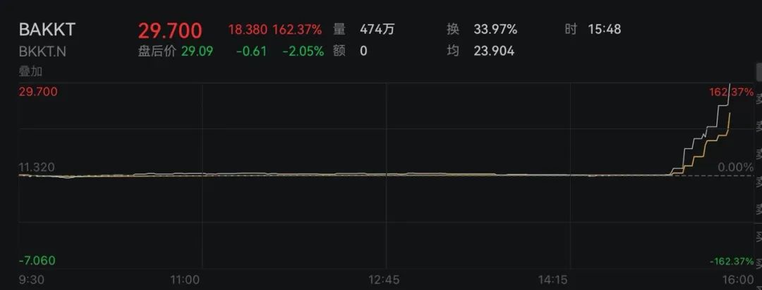 受此消息影响,美股Bakkt尾盘数次熔断,收盘涨超160%。