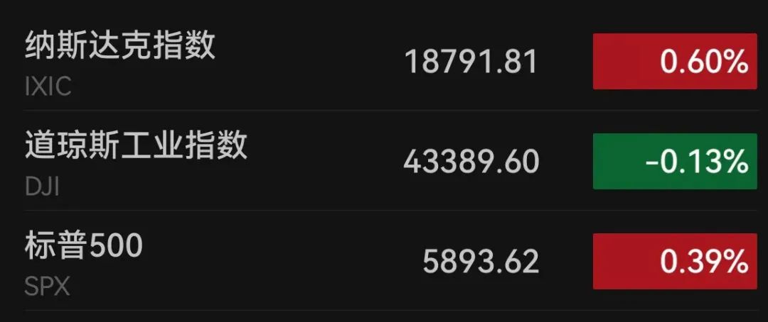 当地时间11月18日,美股三大股指涨跌不一,截至收盘,道指跌55.39点,跌幅为0.13%,报43389.60点;纳指涨111.69点,涨幅为0.60%,报18791.81点;标普500指数涨23.02点,涨幅为0.39%,报5893.62点。