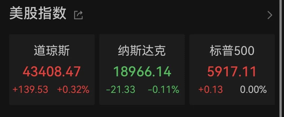截至收盘,道指涨0.32%,报43408.47点;标普500指数持平0%,报5917.11点;纳指跌0.11%,报18966.14点。