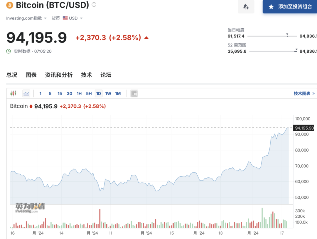 美股早盘时段,比特币价格一度飙升至9.49万美元以上,接近9.5万美元的门槛,连续第二日创历史新高。
