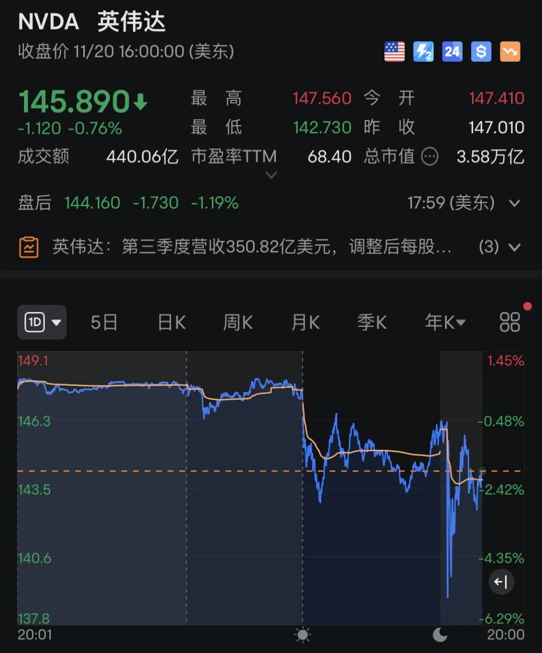 英伟达第三财季净利润增长109%,但因营收展望未达到最高预期,盘后股价一度跌超5%。