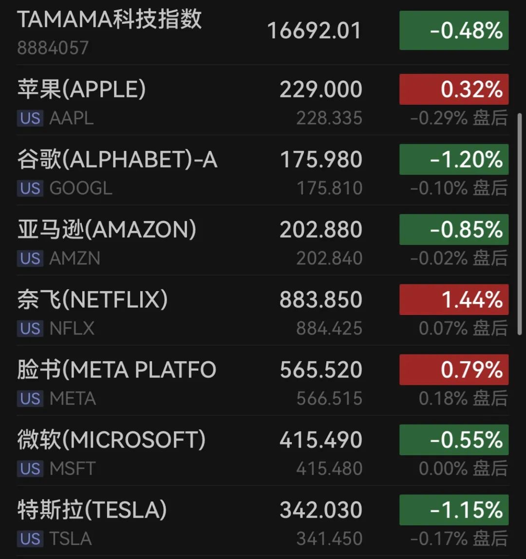 大型科技股多数下跌,TAMAMA科技指数0.48%。个股方面,谷歌跌超1%,特斯拉跌逾1%,亚马逊跌0.85%,英伟达跌0.76%,微软跌0.55%,苹果涨0.32%,脸书涨0.79%。