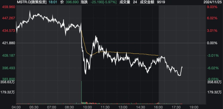 受到加密货币市场大跌影响,美股MicroStrategy当天大跌超4%。美股盘后,该股继续下挫,一度跌约4%。上周,有消息称该公司买入了超过5万个比特币。此前,随着特朗普胜选后比特币价格一路走高,该公司股价也节节攀升,累计最大涨幅超过100%。